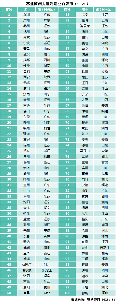 2021年11月29日,賽迪顧問智能裝備產(chǎn)業(yè)研究中心發(fā)布《賽迪顧問先進(jìn)制造業(yè)百?gòu)?qiáng)市(2021)》榜單。深圳、廣州、蘇州、杭州、南京、寧波、青島、武漢、成都和長(zhǎng)沙位列前十名。江蘇十三個(gè)地市全部上榜,蘇州
