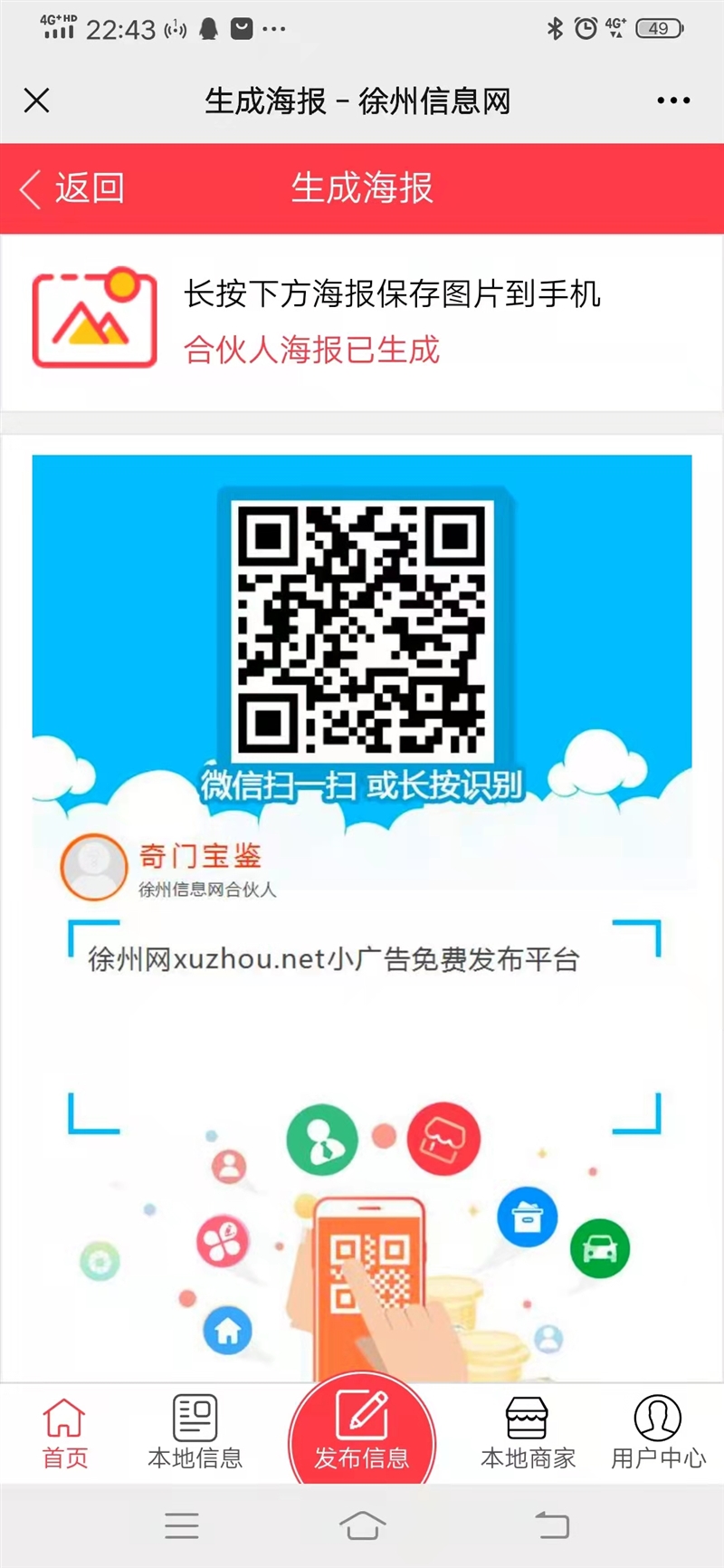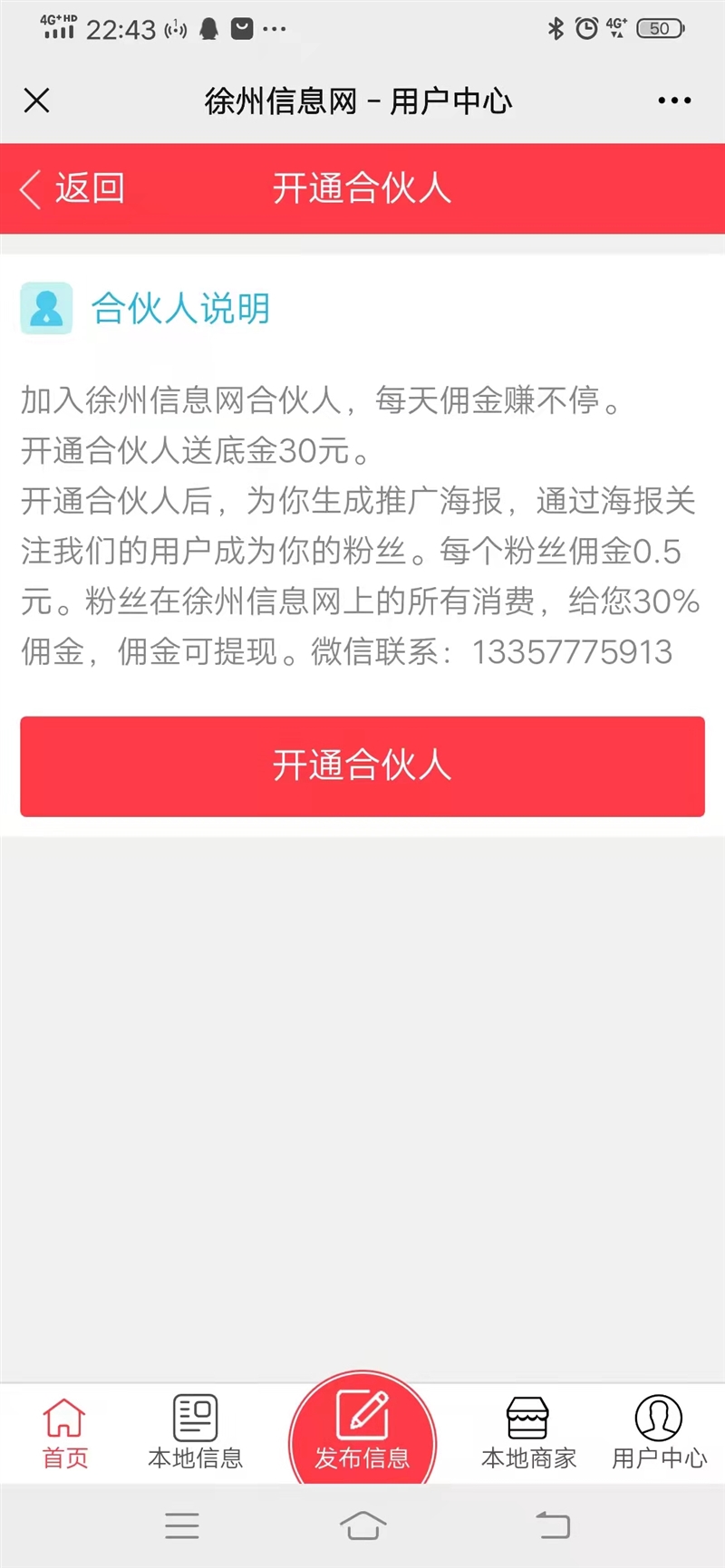 開通徐州網合伙人 分享海報到朋友圈 掃碼就有30元傭金拿